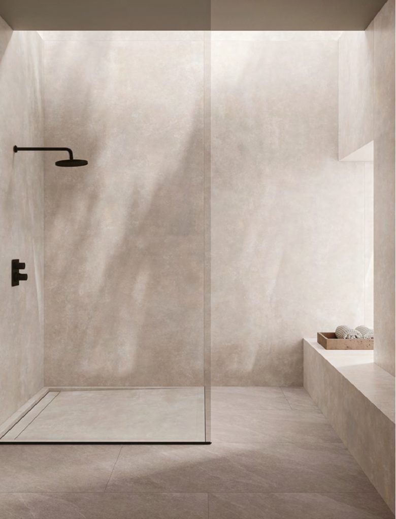 Die Verlegung von Großformatigen Fliesen in der Dusche ermöglicht ein fast fugenloses Bild. Das bewirkt das kleinere Räume optisch größer erscheinen. Auch die Reinigung der Fliesen wird durch weniger Fugenanteil deutlich erleichtert. Großformatige Fliesen gibt es in verschiedenen Optiken wie Mamor, Stein, Metall oder auch einfarbig.